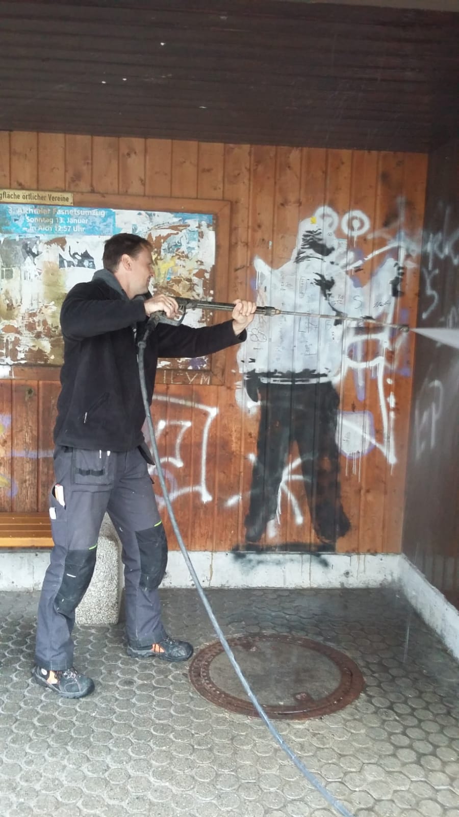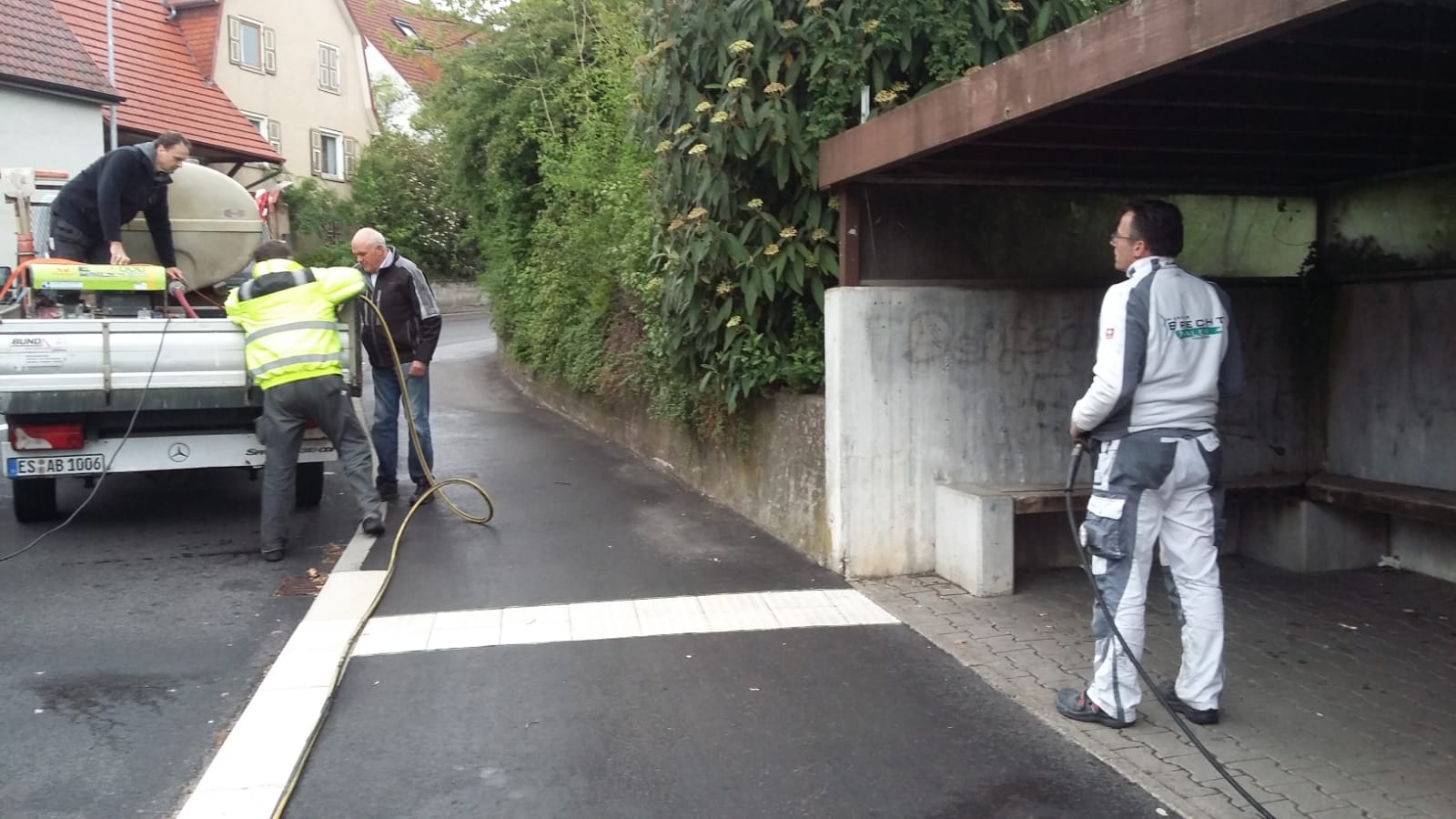 Manchen ist es sicherlich am Montag, den 29. April bereits aufgefallen, als mit "schwerem Gerät" der Firma Brecht, der Firma Bund sowie FRS FeinRohrService an den Bushaltestellen angerückt wurde. Leider war es trotz intensiver Vorbehandlung durch Markus Brecht nicht möglich die Sandsteine von den Graffiti-Schmiereien zu befreien. Mit fast 1000 Liter Wasser sind Adalbert BundMatthias Kohn und Daniel Aichinger dann der bereits abblätternden Farbe am Holz auf die Pelle gerückt. Blätter, Dreck und Kippenreste wurden dabei von der Mauer und unter den Sitzgelegenheiten auch gleich entfernt und so war man doch positiv gestimmt, als der "Reinigungstrupp" nach Neuenhaus abrückte.